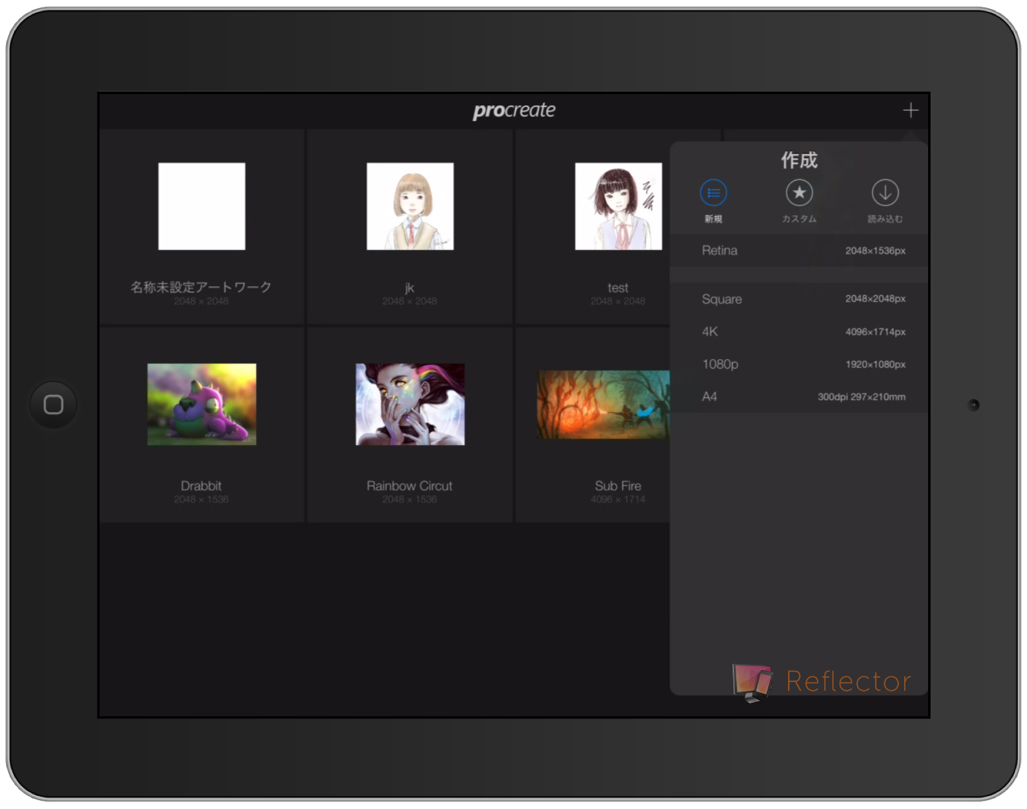 まず、ProCreateを起動するとサンプルイラストが出るが右上の「+」ボタンで新規キャンバスを作成することができる。
