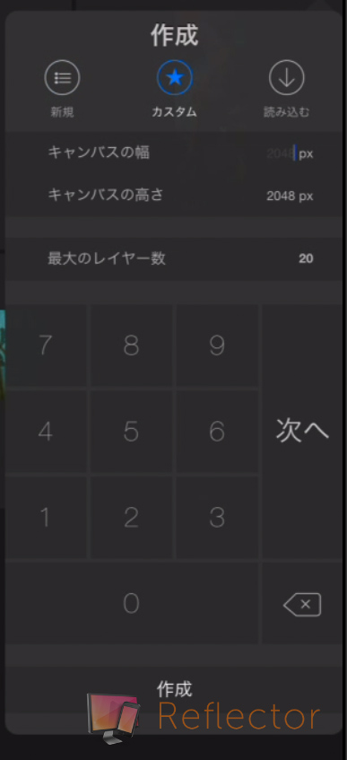そこから必要な大きさを選択する他、「カスタム」から自分が作成したいキャンバスの大きさを指定することも、最大レイヤー数も決めることができる。