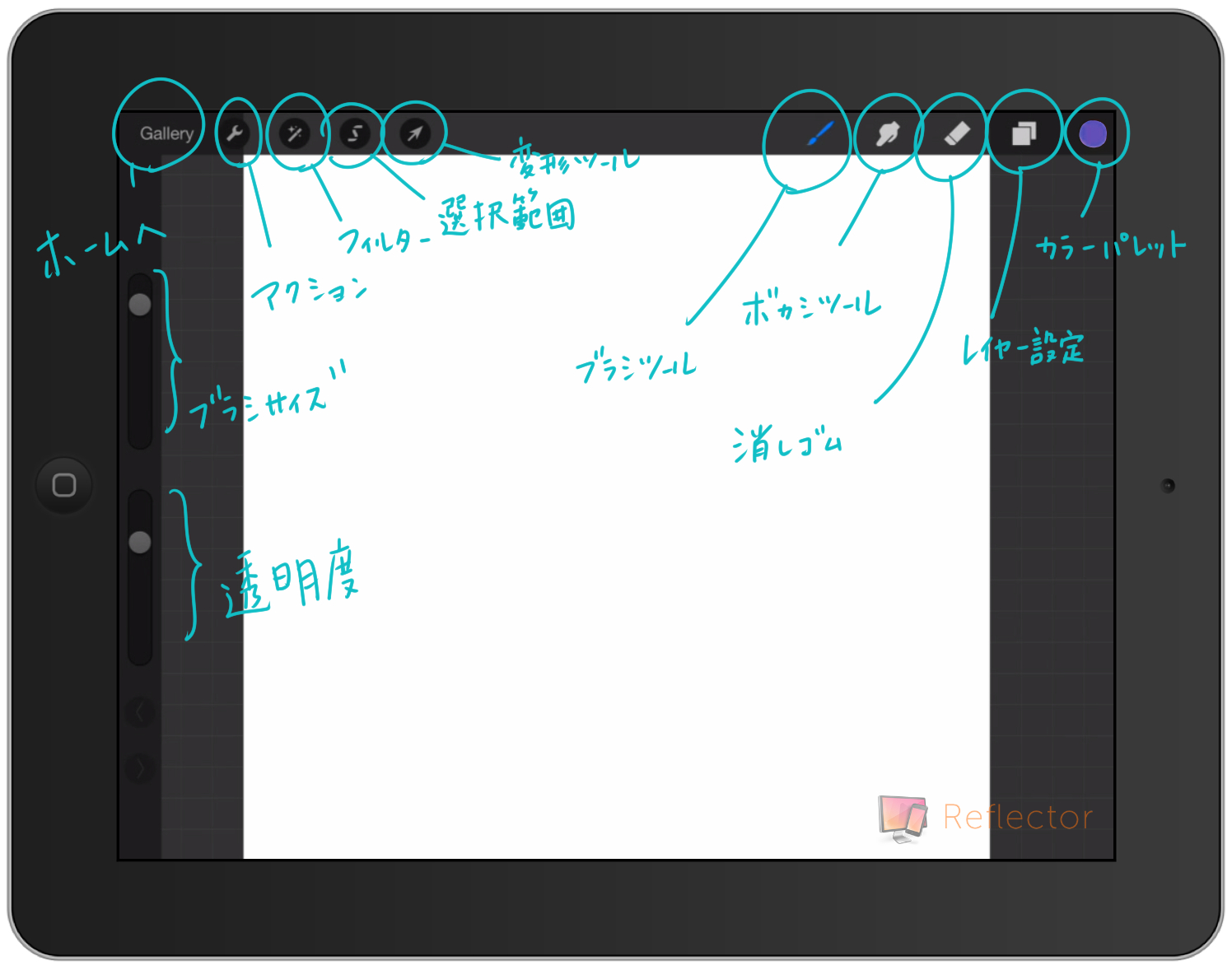 まず、「gallery」は、サンプルイラストや用紙作成のホーム画面に戻るボタン。