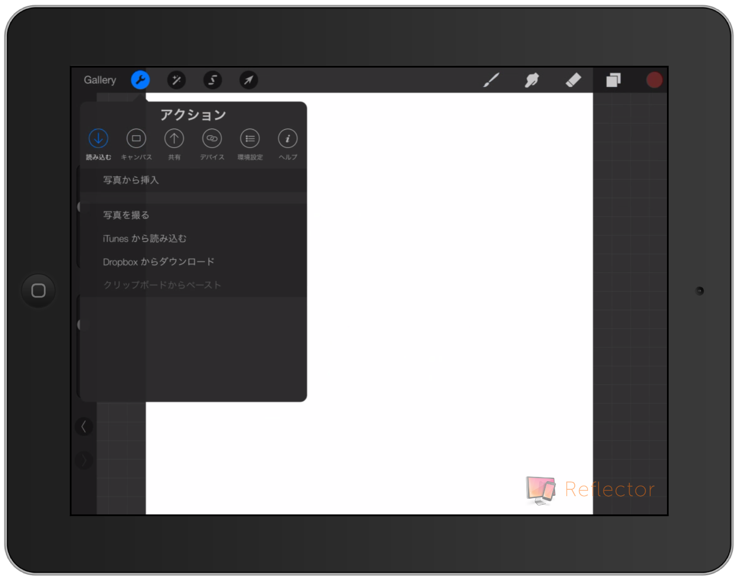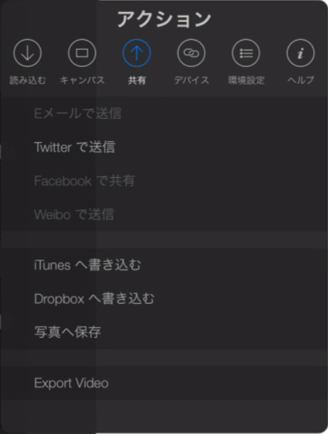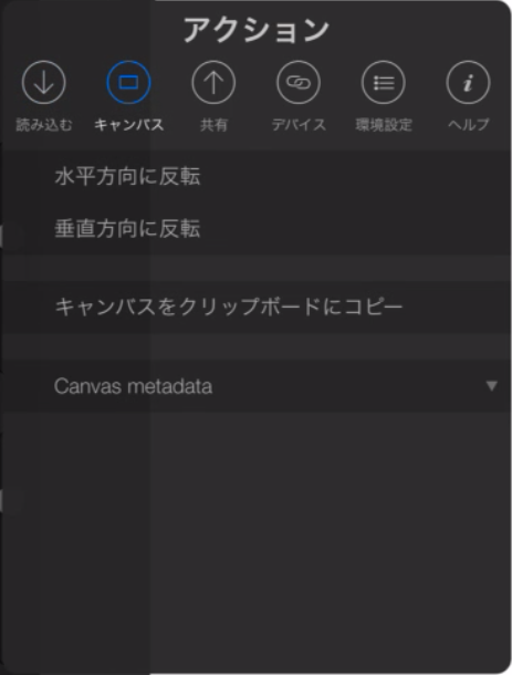 アクションには「読み込む」「キャンバス」「共有」「デバイス」「環境設定」「ヘルプ」の項目がある。