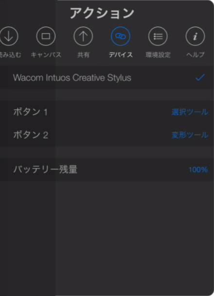 使用したいデバイスを選ぶと(ここではWacom Intuos Creative Stylus)、ボタン二つのショートカット設定ができ、電池の残量も見る事ができる。