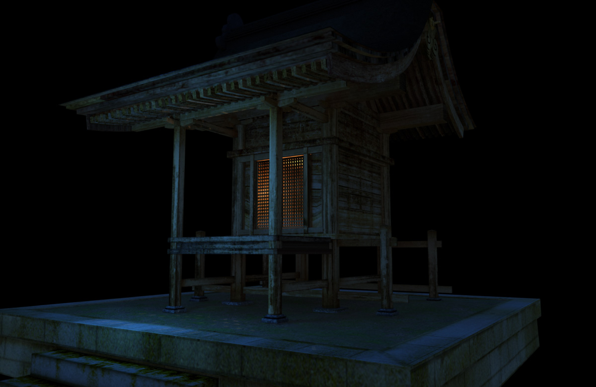 話は戻って、この社、鳥居、稲荷などを配置したシーンのイメージは太陽サンサンではなく、零のイメージなので暗くてじめじめ、ちょっと不気味な方向性。