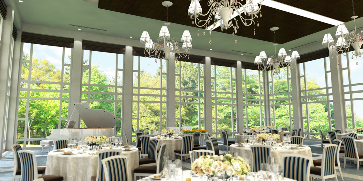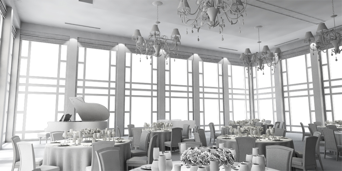 ライトはHDRI、太陽光として無限遠1灯、天井からスポット灯(影なし)、新郎新婦席にスポット2灯、各テーブルの真上にスポット(8灯)、下がり天井の立ち上がり部分に発光の間接光、下がり天井面に十字の発光、会場手前の壁面に大きい発光面、新郎新婦席のテーブルに間接光として発光面、を設置してある。