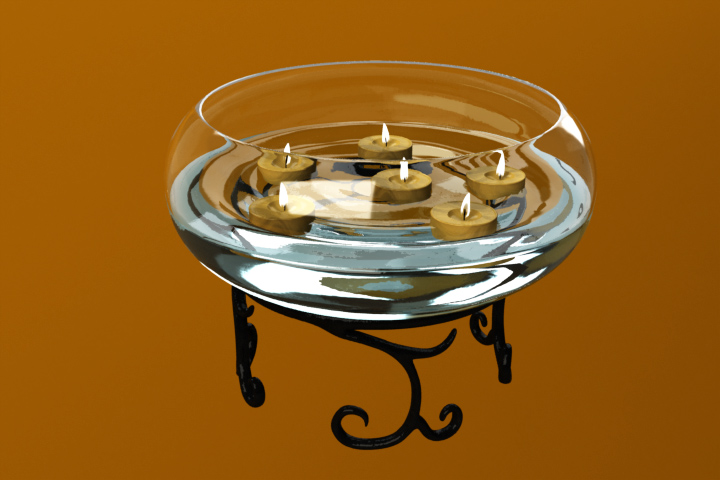 ただし今回は花だけで完結するのは避けようと思い(めんどいので)、参考画像を組み合わせて水の入ったガラス容器に蝋燭をキャンドルを浮かべ、回りに花を配置する、ということにした。