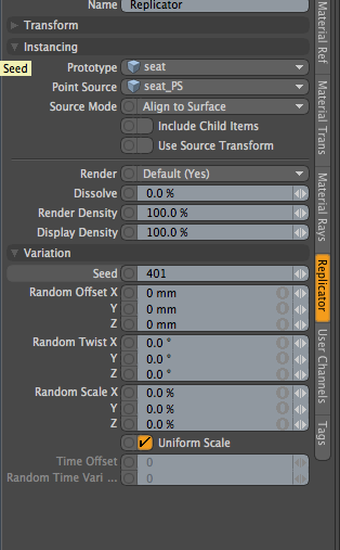 Prototypeには配置したいメッシュ「seat」を、Point Sourceには配置元となる「seat_PS」を。