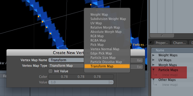 まだこのままでは先ほどのメッシュの時と変わらないため、「seat_PS」メッシュを選択してからListsタブの「Particle Maps」から新規マップをクリックして、プルダウンメニューから「Transform Map」を作成する。