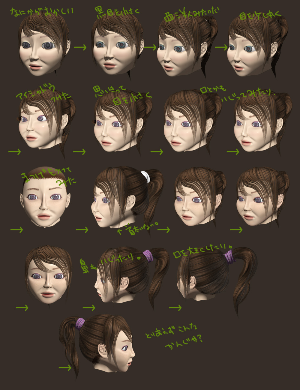 ま、そもそも分割をどこで区切るかがわからなくて(二冊の本を手元に置いて見てるにも関わらず!)、かつて3年前にshadeのポリゴンで挑戦した顔とまったく同じ、いやそれ以下のできになったのであった。