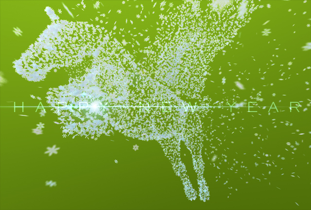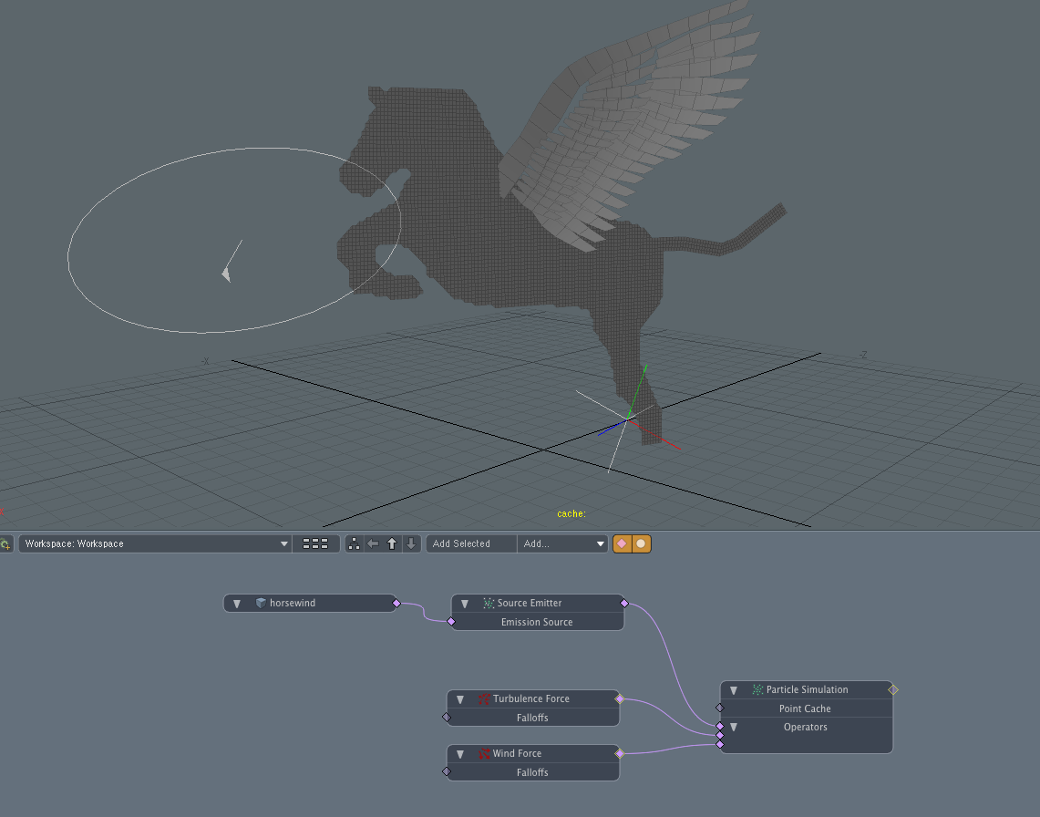 これだけだとつまらないので馬の横の形状をメッシュでざっくりトレースし、それをパーティクルの発生源にして横から風をあて飛び散らすパーティクルシミュレーションを行った。