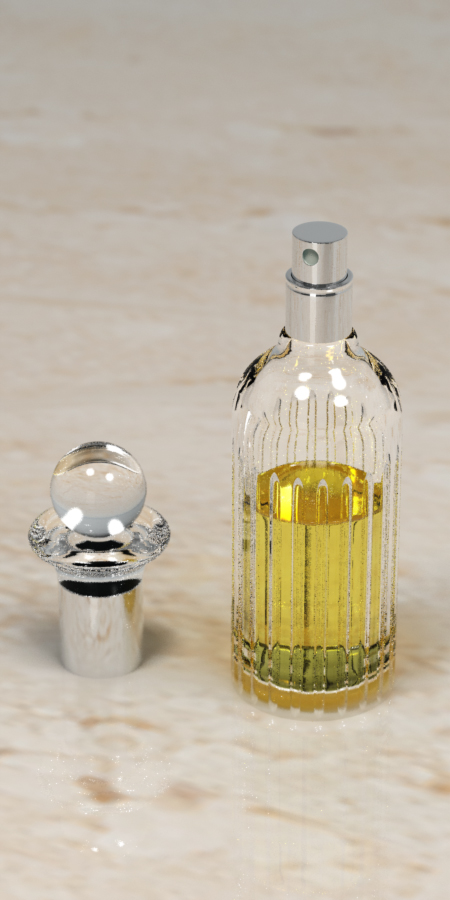 昨日の香水瓶をレンダリングしたときにコースティクスまで表現されていて驚いたのだけど、サンプルのLiquidをみるともっとはっきり接地面に光が映っている。