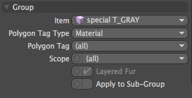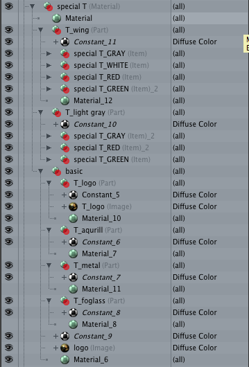 変更がないところは「basic」としてまとめ、色変更の部分「T-wing」「T-light gray」をマテリアルグループの「パート」で選び、その中にグループを4つ作り、各メッシュ(一つはベースメッシュ、他の3つはインスタンス)を選択している。